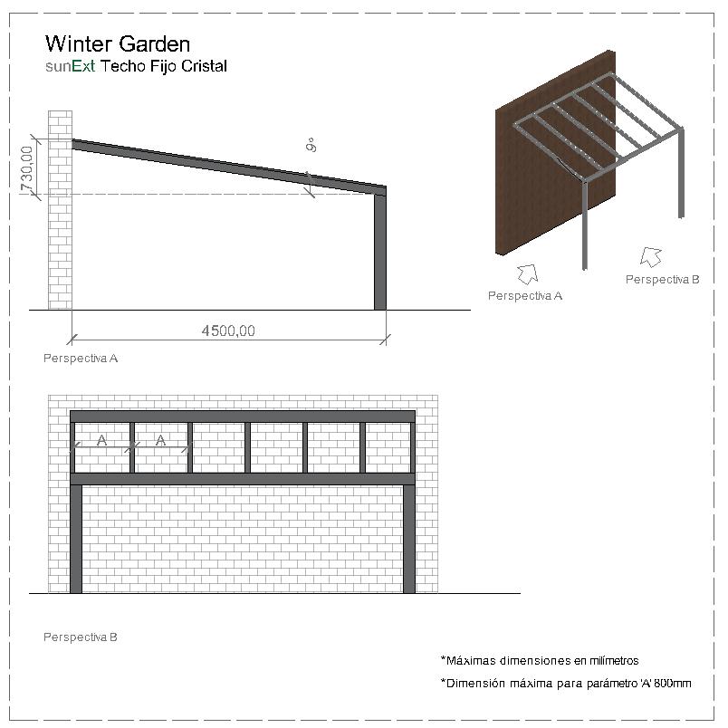Está fabricado de perfiles de aluminio y paneles de vidrio laminado, de policarbonato o de vidrio fotovoltaico. Ofrece un espacio luminoso , donde entra gran cantidad de luz natural, en días soleados y protege de condiciones adversas en días lluviosos, nieve e incluso viento. Compatible para zonas de montañas, zonas lluviosas, sombrías y frescas.