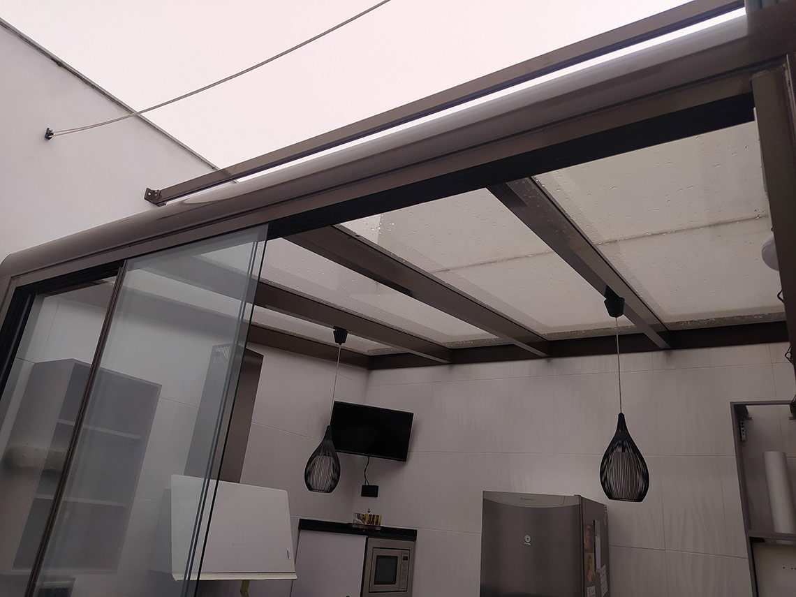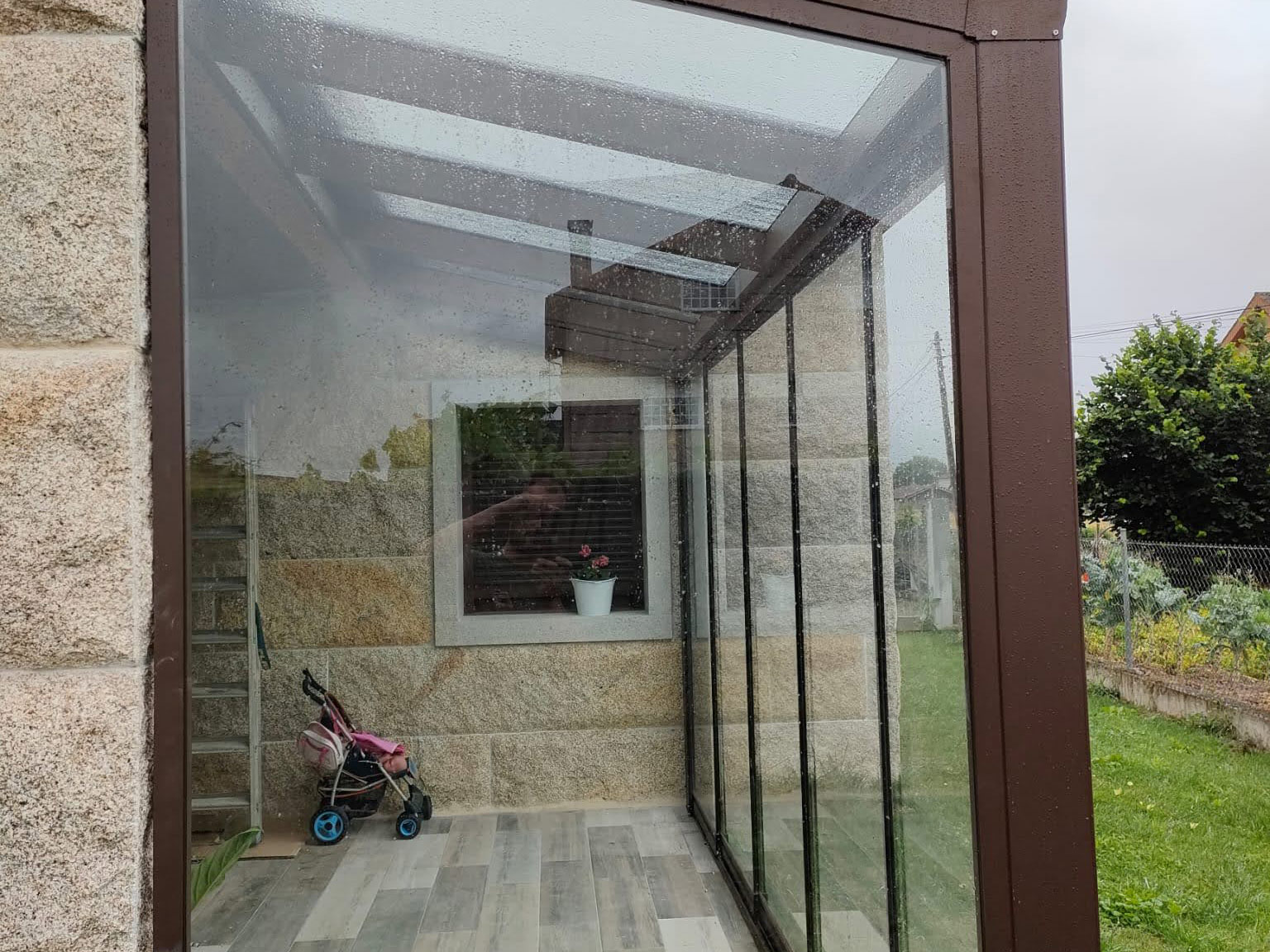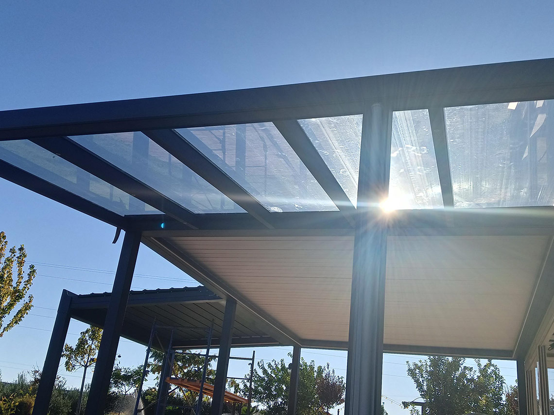 Está fabricado de perfiles de aluminio y paneles de vidrio laminado, de policarbonato o de vidrio fotovoltaico. Ofrece un espacio luminoso , donde entra gran cantidad de luz natural, en días soleados y protege de condiciones adversas en días lluviosos, nieve e incluso viento. Compatible para zonas de montañas, zonas lluviosas, sombrías y frescas.