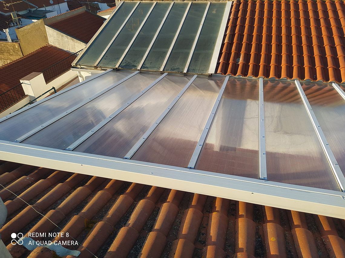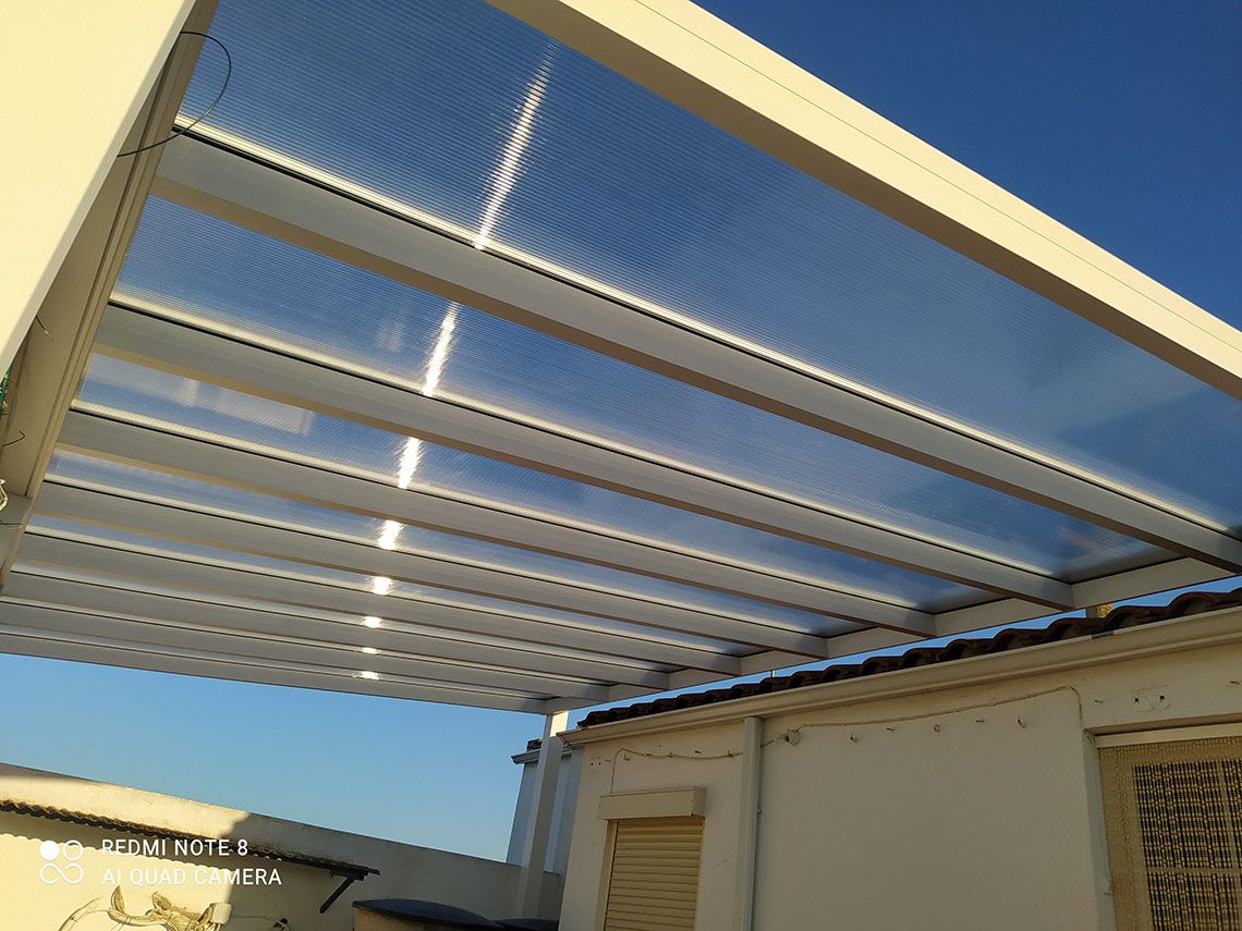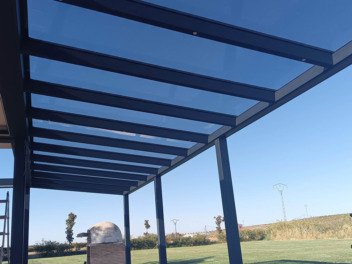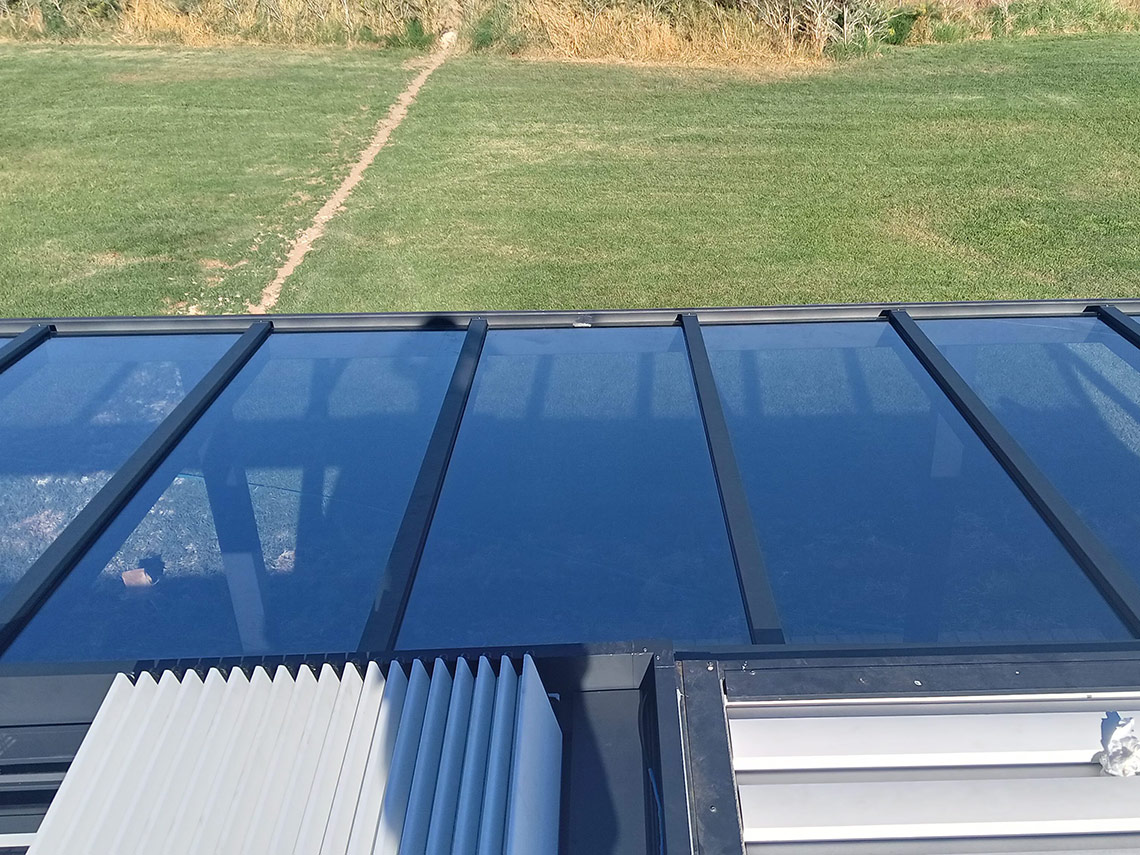 Está fabricado de perfiles de aluminio y paneles de vidrio laminado, de policarbonato o de vidrio fotovoltaico. Ofrece un espacio luminoso , donde entra gran cantidad de luz natural, en días soleados y protege de condiciones adversas en días lluviosos, nieve e incluso viento. Compatible para zonas de montañas, zonas lluviosas, sombrías y frescas.