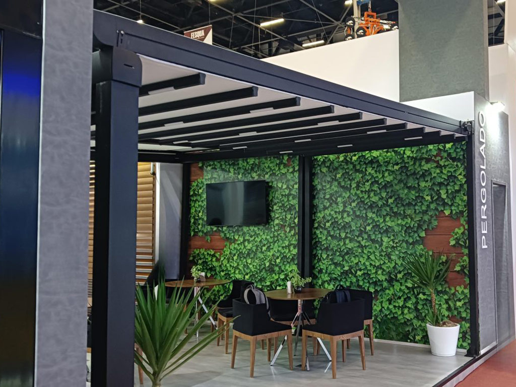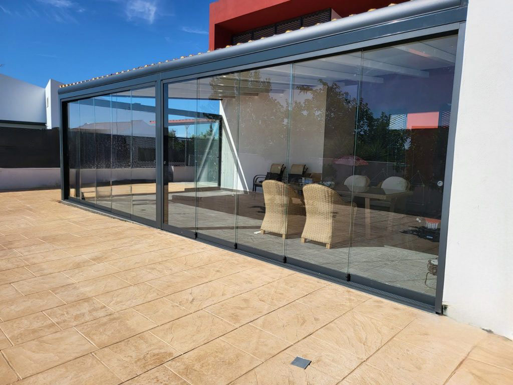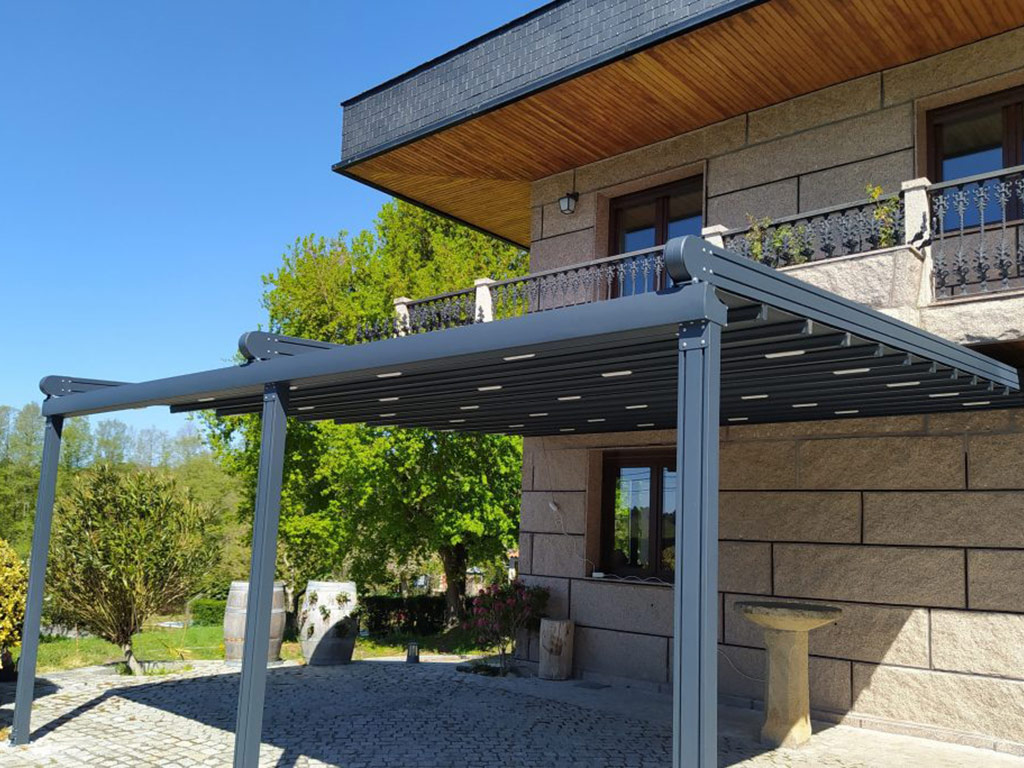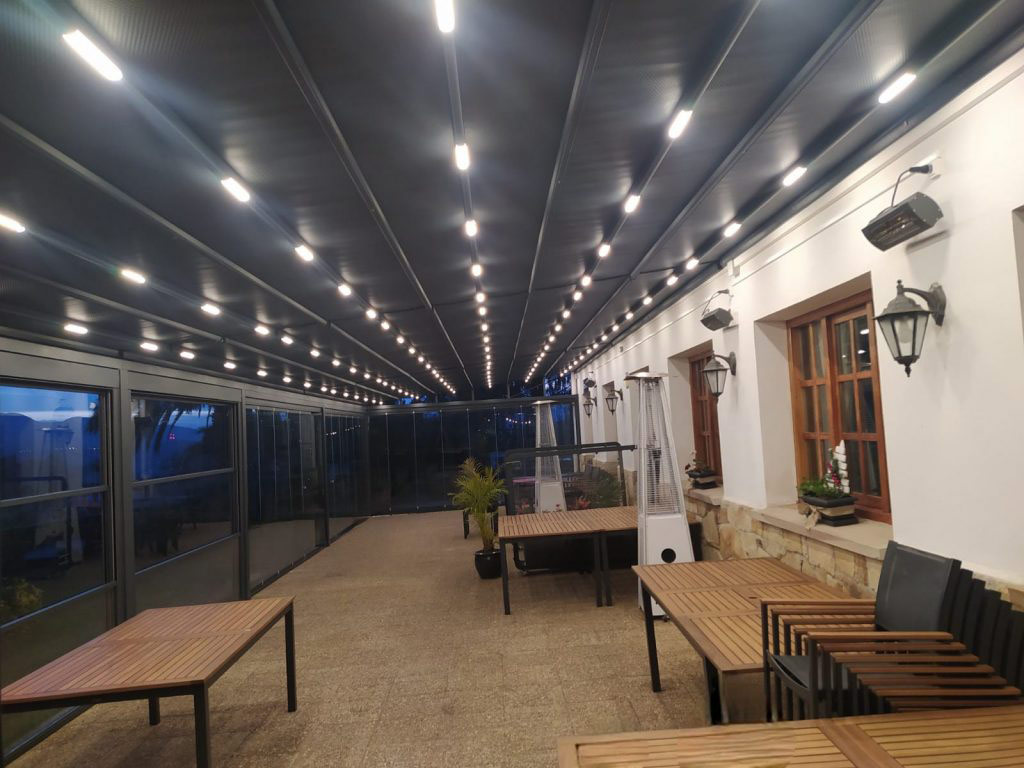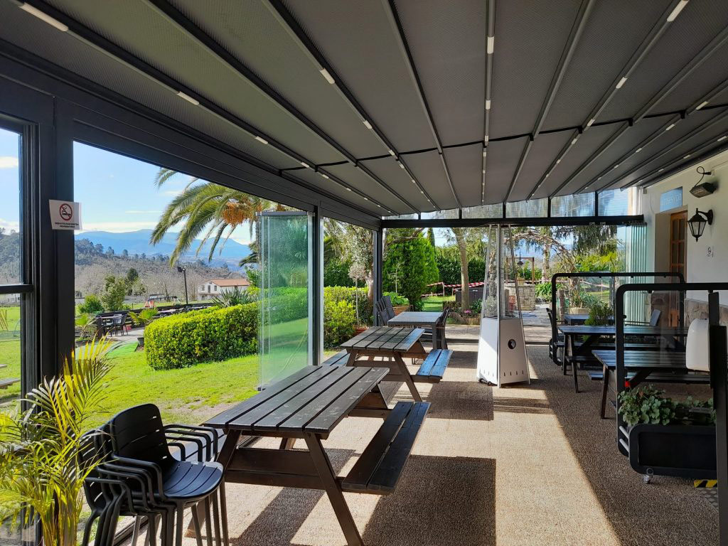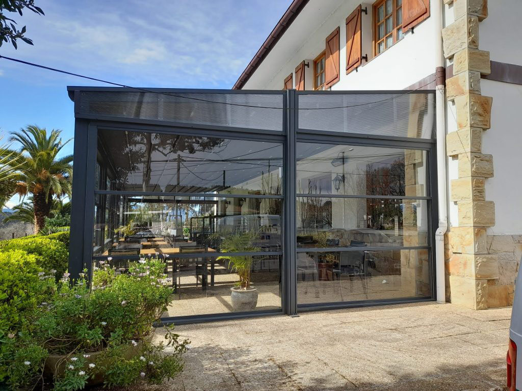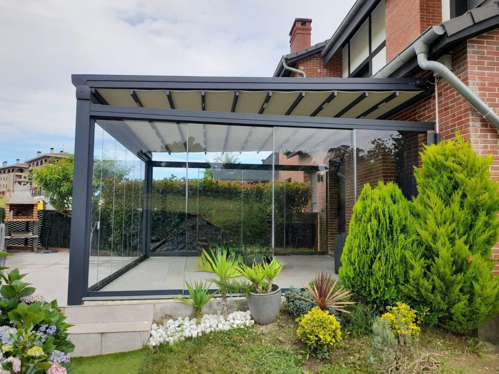 Está diseñado por perfiles de aluminio y un toldo automático dotándolo de un diseño estético y elegante, haciendo posible el uso de estos espacios en cualquier estación del año.